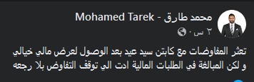 وقال محمد طارق السعيد عضو مجلس إدارة نادي الترسانة علي صفحته الشخصية على موقع التواصل الاجتماعي فيس بوك ان تعثر المفاوضات مع سيد عيد المدير الفني جاء بسبب طلب الأخير مبلغ مالي خيالي.