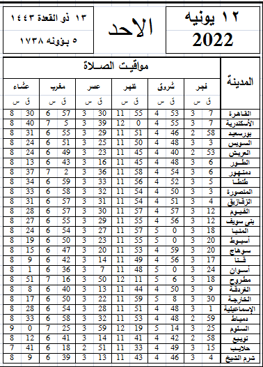 مواقيت الصلاة اليوم وفقًا للتوقيت المحلي لمدينتي القاهرة والإسكندرية وعدد من مدن ومحافظات الجمهورية: