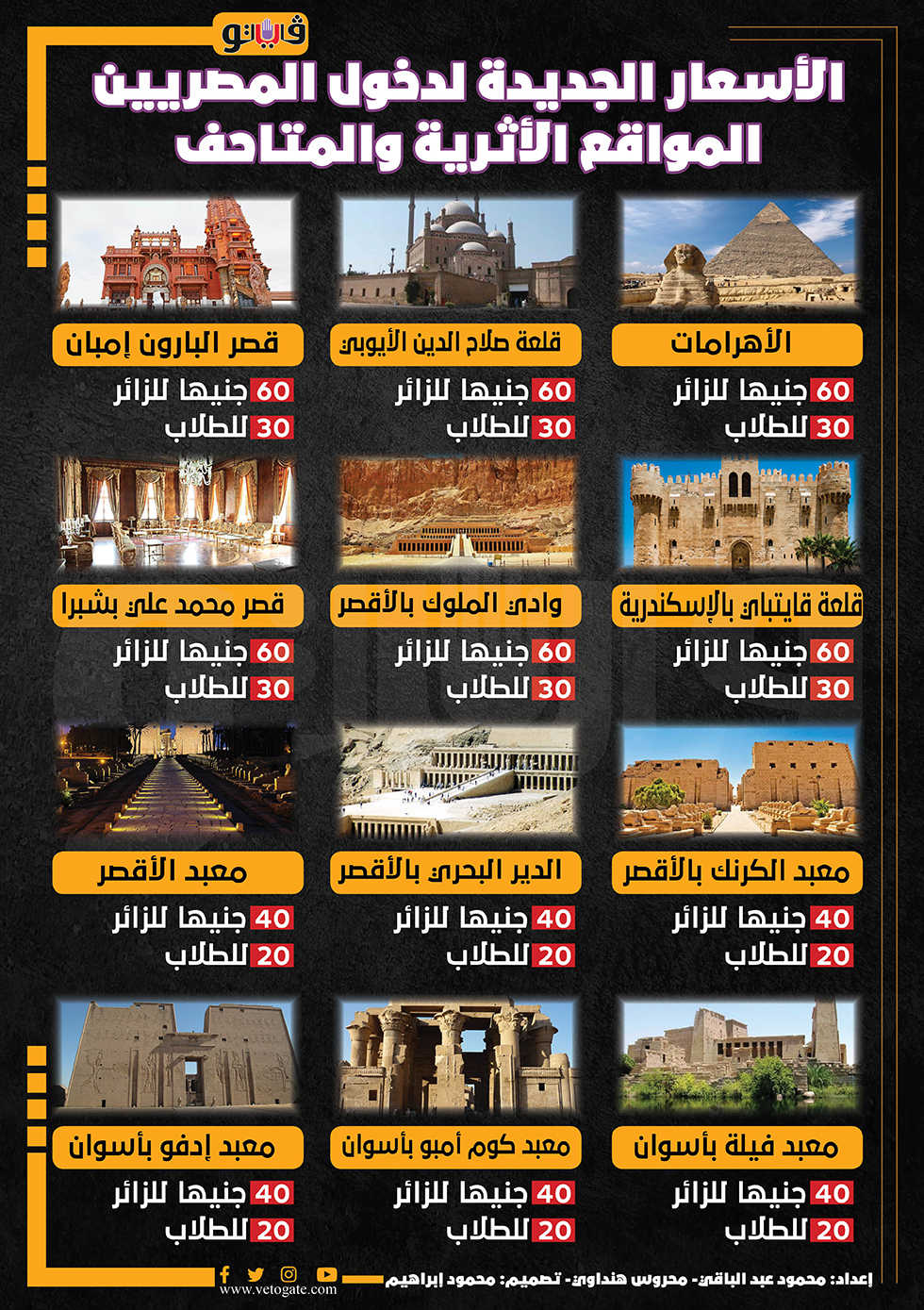 الأسعار الجديدة لدخول المصريين المواقع الأثرية والمتاحف | إنفوجراف السبت 11/يونيو/2022 - 04:30 م 6/11/2022 4:30:36 PM الأسعار الجديدة لدخول المصريين المواقع الأثرية والمتاحف محمود عبد الباقى – محروس هنداوي شارك طباعة 18 حجم الخط شارك طباعة قصر محمد علي بشبرا الأقصر قلعه قايتباى الأهرامات قلعة صلاح الدين الأيوبى قلعة قايتباي بالاسكندريه معبد الكرنك معبد ادفو قصر البارون