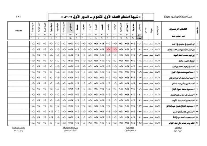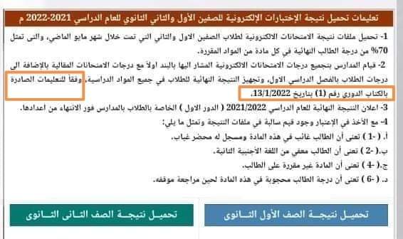 وأشارت إلى قيام المدارس بتجميع درجات الامتحانات الإلكترونية مع درجات الامتحانات المقالية بالإضافة إلى درجات الطلاب في الفصل الدراسي الأول وتجهيز نتيجة الصفين الأول والثاني الثانوي النهائية للطلاب في جميع المواد الدراسية، وفقا للتعليمات الصادرة بالكتاب الدوري 1 بتاريخ 12 يناير 2022، وإعلان نتيجة الصفين الأول والثاني الثانوي النهائية الدور الأول في المدارس فور الانتهاء من إعدادها في شكلها النهائي.