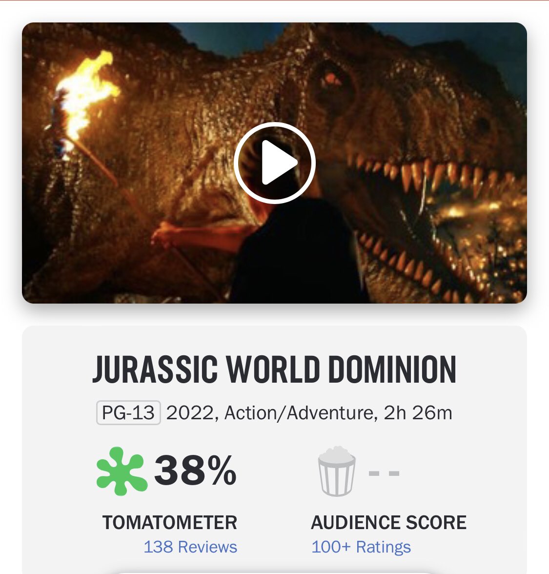 وسبب أخر وهو حصول فيلم JURASSIC WORLD DOMINION على نسبة تقييم 38% علي موقع التقيمات الشهير Rotten Tomatoes، وذلك بعد 138 مراجعة نقدية، وهو ما جعل الجهور يري لمحة من الفيلم قبل دخوله في السينمات.