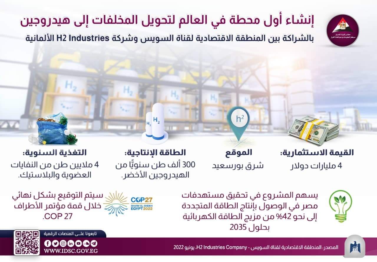 نشر مركز المعلومات ودعم اتخاذ القرار بمجلس الوزراء المصري إنفوجرافيك جديدًا يرصد خلاله أبرز المعلومات حول توقيع مذكرة تفاهم أول مصنع من نوعه لتحويل المخلفات إلى هيدروجين عالميًّا، بين المنطقة الاقتصادية لقناة السويس وشركة H2 Industries الألمانية المتخصصة في تخزين الطاقة.