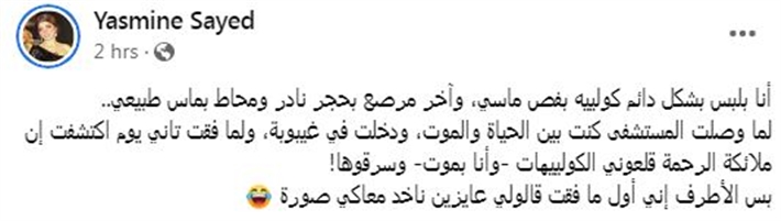 وكتبت ياسمين الخطيب عبر حسابها على موقع التواصل الاجتماعي "فيس بوك"، منشورًا قالت فيه: "أنا بلبس بشكل دائم كولييه بفص ماسي، وآخر مرصع بحجر نادر ومحاط بماس طبيعي، لما وصلت المستشفى كنت بين الحياة والموت، ودخلت في غيبوبة، ولما فقت تاني يوم اكتشفت إن ملائكة الرحمة قلعوني الكولييهات -وأنا بموت- وسرقوها".