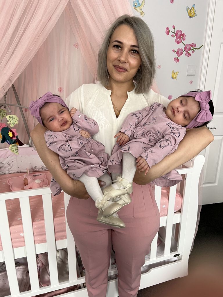 وقالت: "اعتقدت أن ظهري سينكسر لأن بطني كانت كبيرة جدًا، التعب الذي اختفى تمامًا وأصبحت في قمة سعادتي عند احتضان طفلتيّ لأول مرة".