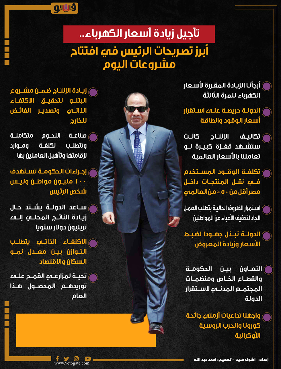 تأجيل زيادة أسعار الكهرباء.. أبرز تصريحات الرئيس في افتتاح مشروعات اليوم | إنفوجراف الإثنين 13/يونيو/2022 - 03:32 م 6/13/2022 3:32:01 PM أشرف سيد شارك طباعة 18 حجم الخط شارك طباعة اسعار الطاقة 100 مليون مواطن تأجيل زيادة أسعار الكهرباء افتتاحات السيسي