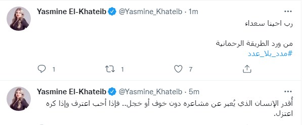 وكتبت ياسمين الخطيب تغريدة على تويتر قالت فيها: "أُقدر الإنسان الذي يُعبر عن مشاعره دون خوف أو خجل.. فإذا أحب اعترف وإذا كره اعتزل".