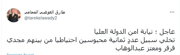 وكتب طارق العوضي تغريدة على تويتر "عاجل؛ نيابة أمن الدولة العليا تخلي سبيل عددٍ ثمانية محبوسين احتياطيا من بينهم مجدي قرقر ومعتز عبدالوهاب".