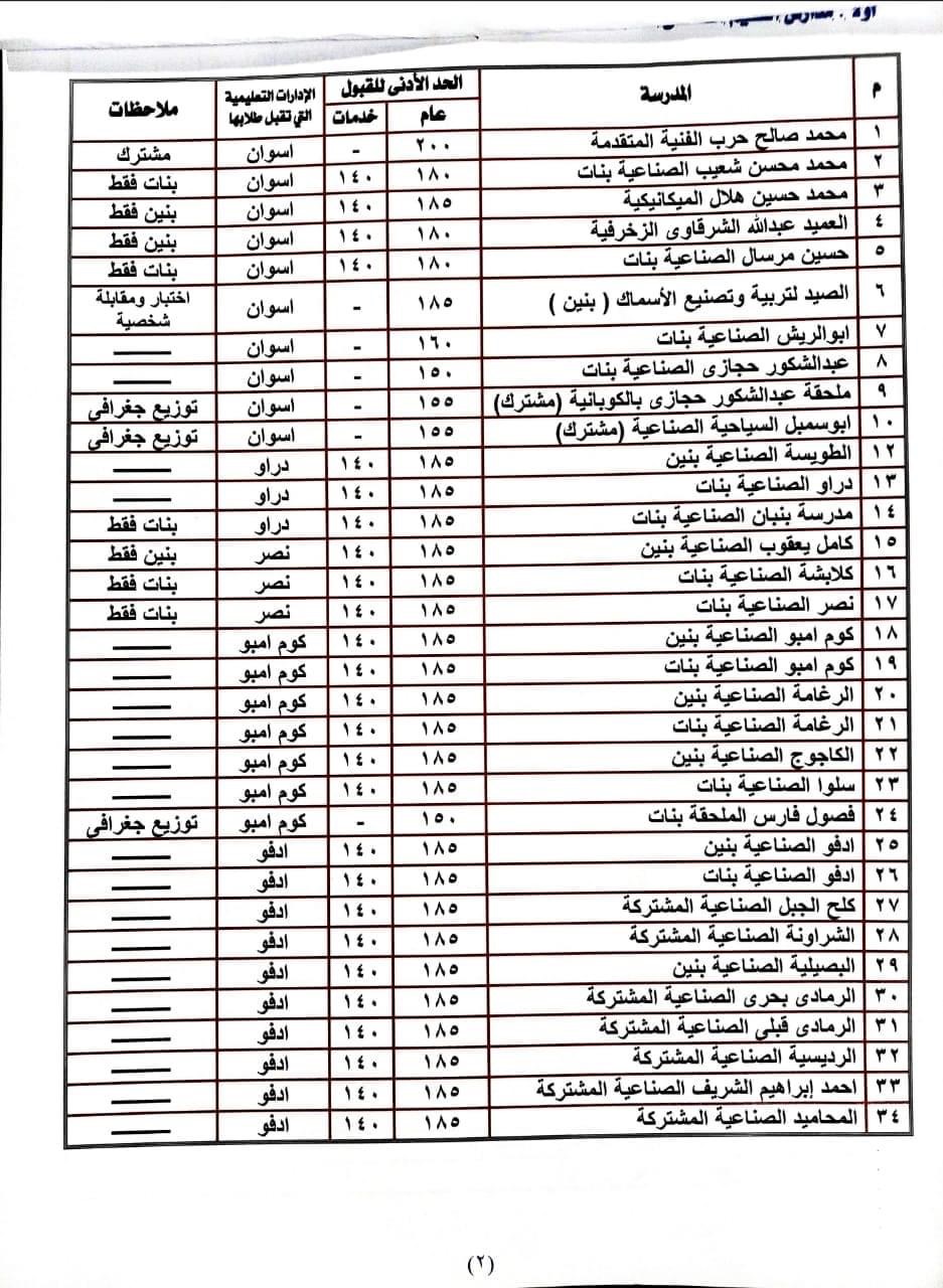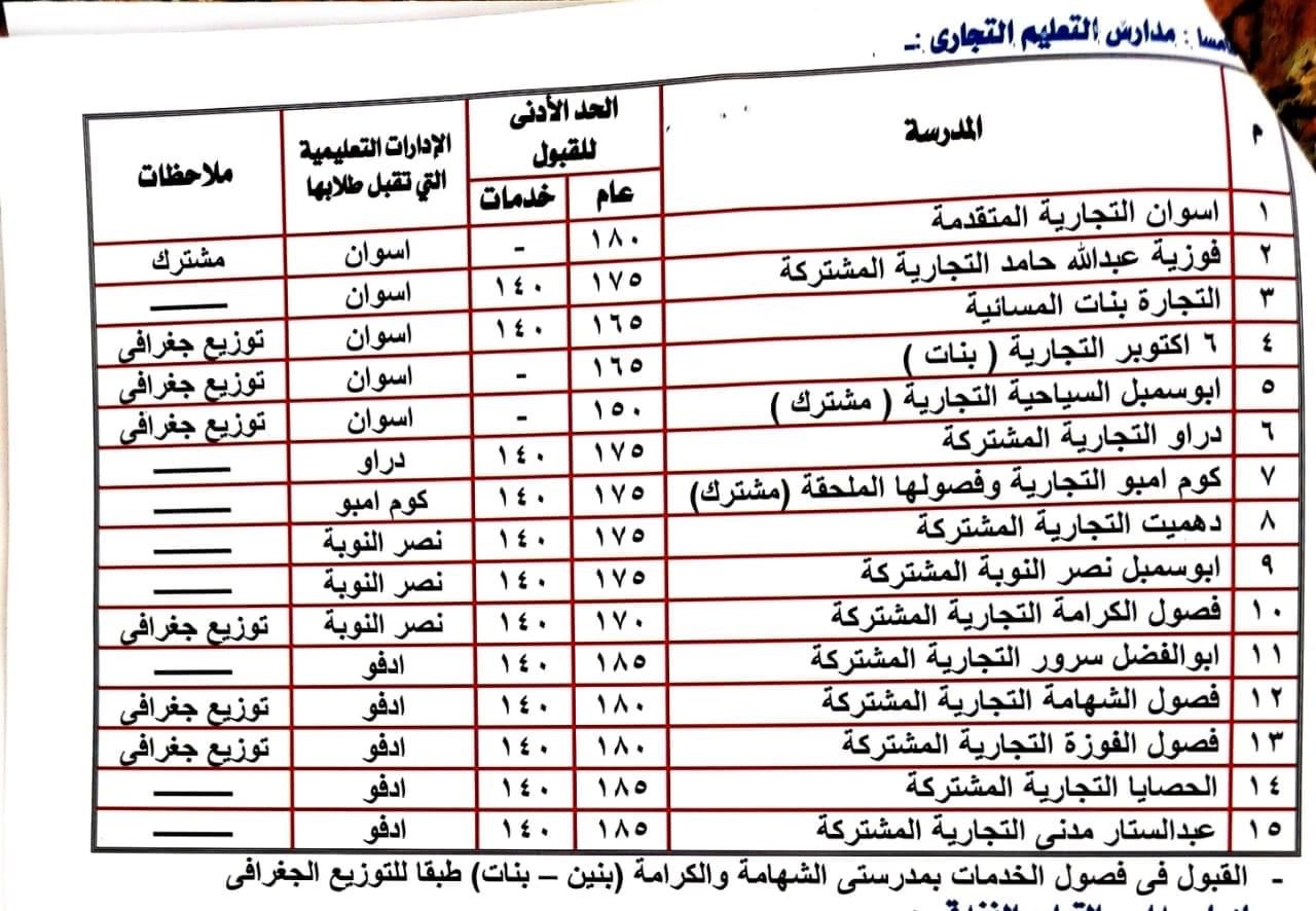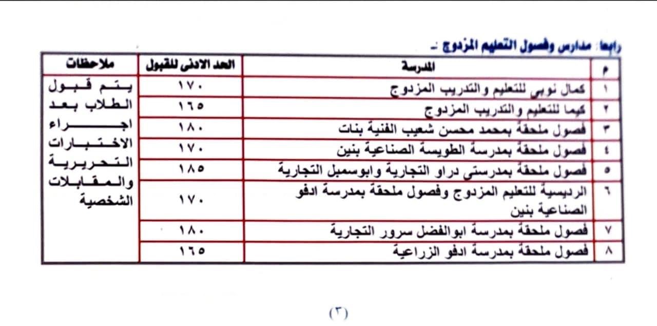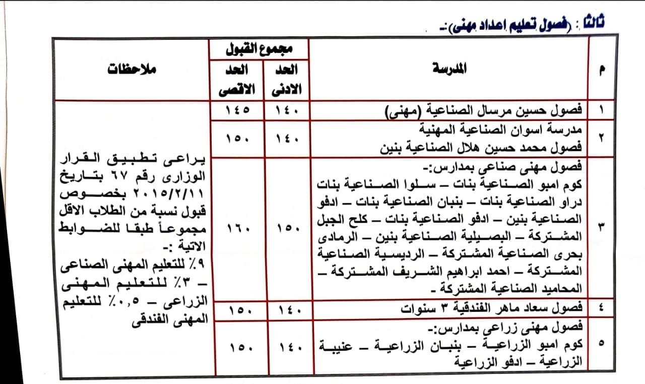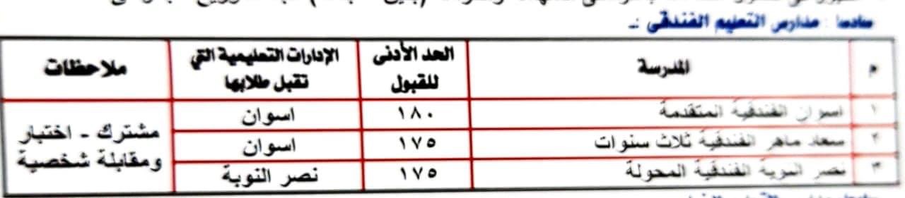 أعلنت مديرية التربية والتعليم بأسوان تنسيق قبول الطلاب بمدارس التعليم الفنى (صناعى - تجارى - فندقى - زراعى - مزدوج) للعام الدراسى المقبل ٢٠٢٣/٢٠٢٢.