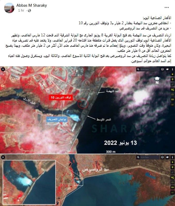 وكتب الدكتور عباس شراقي تدوينة على الفيس بوك "الأقمار الصناعية اليوم:- انخفاض مخزون سد النهضة بمقدار 2 مليار م3 وتوقف التوربين رقم 10.. - مزيد من التصريف فى سد الروصيرص".