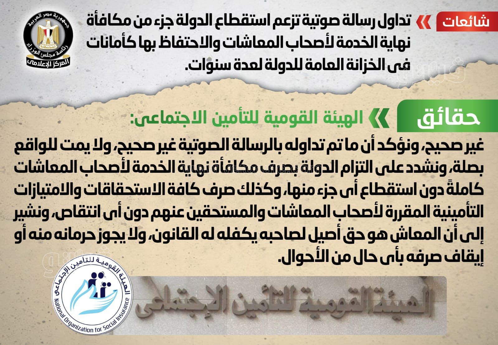 وتواصل المركز الإعلامي لمجلس الوزراء مع الهيئة القومية للتأمين الاجتماعي، والتي نفت تلك الأنباء، مُؤكدةً أنه لا صحة لاستقطاع أي جزء من مكافأة نهاية الخدمة لأصحاب المعاشات أو الاحتفاظ بها كأمانات في الخزانة العامة للدولة لعدة سنوات، وأن ما تم تداوله بالرسالة الصوتية غير صحيح ولا يمت للواقع بصلة.