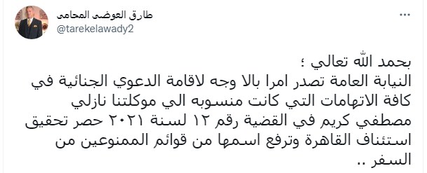 وكتب طارق العوضي تغريدة على تويتر " بحمد الله تعالي؛ النيابة العامة تصدر امرا بالا وجه لاقامة الدعوي الجنائية في كافة الاتهامات التي كانت منسوبه الي موكلتنا نازلي مصطفي كريم في القضية رقم ١٢ لسنة ٢٠٢١ حصر تحقيق استئناف القاهرة وترفع اسمها من قوائم الممنوعين من السفر.."