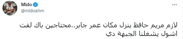 في الوقت الذي طالب أحمد حسام ميدو بتغير في اللاعبين فقال: " لازم كريم حافظ ينزل مكان عمر جابر.. محتاجين باك لفت اشول يشغلنا الجبهة دي"
