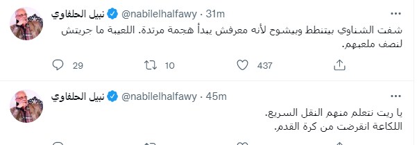 وكتب نبيل الحلفاوي تغريدة على تويتر "وأغرب لقطة كانت لما انطلق رفعت في هجمة مرتدة ولعب عرضية إلى منطقة الجزاء. فإذا بها خالية تماما. محدش جري معاه. كانوا بيتفرجوا زينا. الهمة يا رجالة. السرعة يا رجالة."