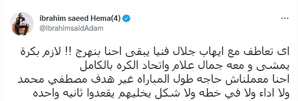 وكتب إبراهيم سعيد تغريدة على تويتر "اى تعاطف مع ايهاب جلال فنيا يبقى احنا بنهرج !! لازم بكرة يمشى ومعه جمال علام واتحاد الكره بالكامل"