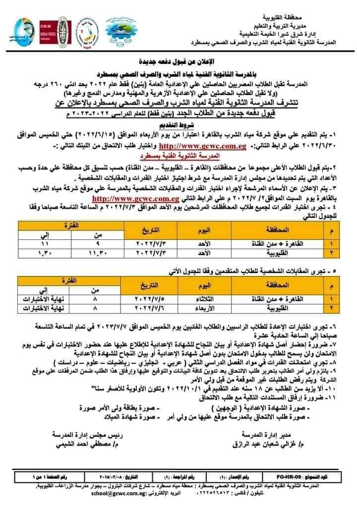 وتتضمن الشروط أيضا، أنه يتم الإعلان عن الأسماء المرشحة لإجراء اختبار القدرات والمقابلات الشخصية بالمدرسة علي موقع شركة مياه الشرب بالقاهرة يوم السبت الموافق 2/ ۲