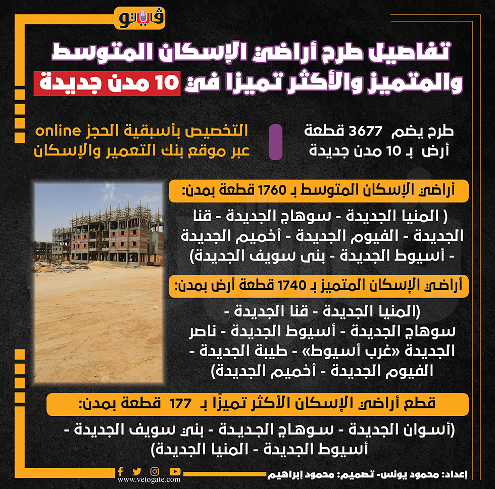 تفاصيل طرح أراضي الإسكان المتوسط والمتميز والأكثر تميزا في 10 مدن جديدة | إنفوجراف الثلاثاء 14/يونيو/2022 - 08:00 م 6/14/2022 8:00:59 PM أراضي الإسكان محمود يونس شارك طباعة 18 حجم الخط شارك طباعة الإسكان المتميز اراضى الاسكان بني سويف الفيوم الجديدة