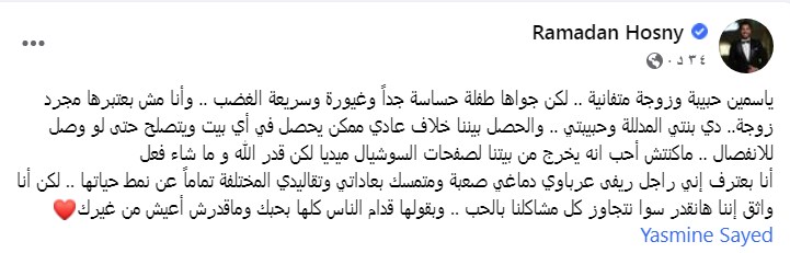 وقال "رمضان": "ياسمين دي بنتي المدللة وحبيبتي، واللي حصل بيننا خلاف عادي ممكن يحصل في أي بيت ويتصلح حتى لو وصل للانفصال، ماكنتش أحب أنه يخرج من بيتنا لصفحات السوشيال ميديا لكن قدر الله وما شاء فعل".