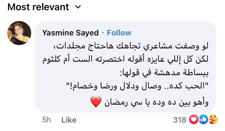 وردت ياسمين الخطيب على رمضان حسني من خلال التعليق على منشوره قائلة: "لو وصفت مشاعري تجاهك هحتاج مجلدات، لكن كل اللي عايزة أقوله اختصرته الست أم كلثوم ببساطة مدهشة في قولها: الحب كده.. وصال ودلال ورضا وخصام! وأهو بين دا ودا يا سي رمضان" الأمر الذي أثار التساؤلات الكثيرة من قبل الجمهور لمعرفة حقيقة عودتهما لبعضهما بعضًا وعودة المياه إلى مجاريها.