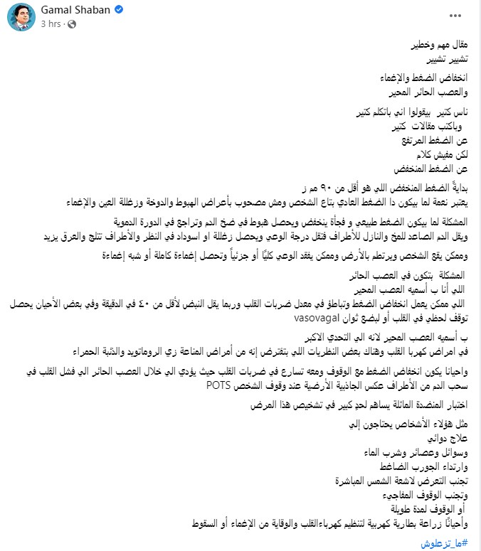 وكتب جمال شعبان تدوينة على الفيس بوك "انخفاض الضغط والإغماء.. والعصب الحائر المحير.. ناس كتير بيقولوا اني باتكلم كتير.. وباكتب مقالات كتير عن الضغط المرتفع لكن مفيش كلام عن الضغط المنخفض"