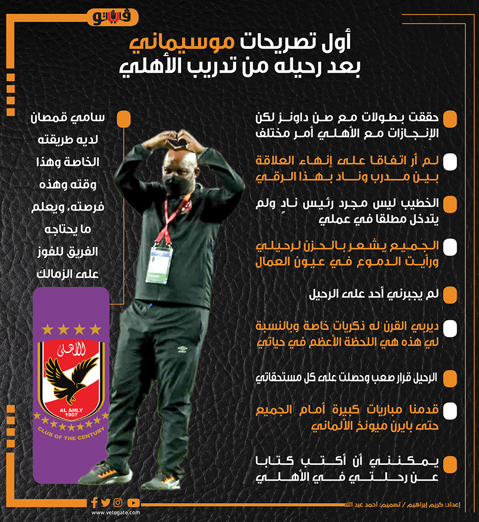 أول تصريحات موسيماني بعد رحيله من تدريب الأهلي|إنفوجراف الأربعاء 15/يونيو/2022 - 05:00 م 6/15/2022 5:00:58 PM تصريحات موسيماني كريم إبراهيم شارك طباعة 18 حجم الخط شارك طباعة الأهلي بيتسو موسيماني الخطيب اخبار الأهلي اخبار الرياضة