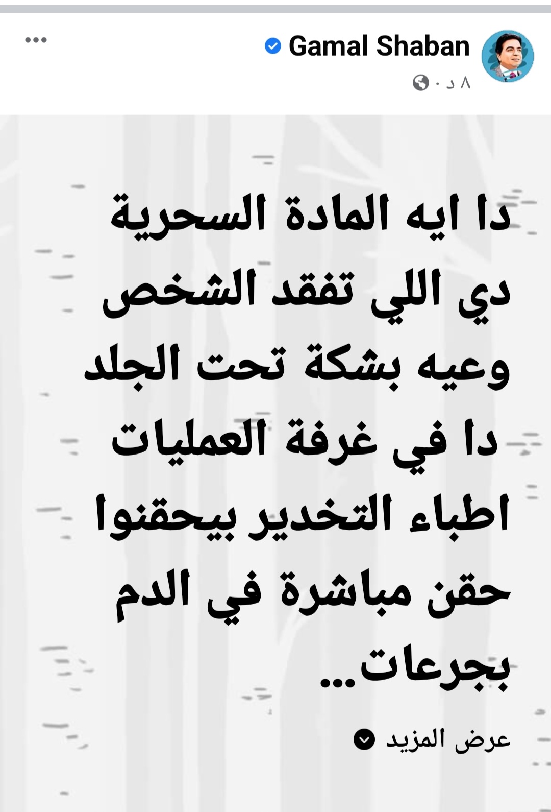 وتساءل علي صفحة التواصل الاجتماعي فيس بوك:" ماهي المادة السحرية التى تفقد الشخص وعيه بشكة تحت الجلد موضحا أنه في غرفة العمليات أطباء التخدير يقومون بالحقن مباشرة في الدم بجرعات غير قليلة وفي أحيان كثيرة يستعصي فقدان الشخص للوعي.. إنهم يدعون إلي طب جديد"