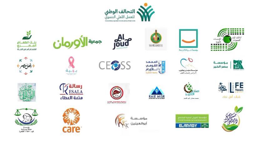ويضم التحالف الوطني كلًّا من الاتحاد العام للجمعيات والمؤسسات الأهلية ومؤسسة حياة كريمة ومؤسسة بيت الزكاة والصدقات المصري ومؤسسة الجود الخيرية وجمعية الأورمان وبنك الطعام المصري ومؤسسة مصر الخير ومؤسسة مجدي يعقوب والمعهد القومي للأورام بكل فروعة والهيئة القبطية الإنجيلية ومؤسسة بهية ومؤسسة أهل مصر ومؤسسة صناع الحياة ومؤسسة راعي مصر وجمعية رسالة، وجمعية الباقيات الصالحات وجمعية رعاية مرضى الكبد ومستشفيات جامعة القاهرة، وكذلك مؤسسة العربي لتنمية المجتمع وجمعية الدكتور مصطفى محمود ومؤسسة صناع الخير ومؤسسة كير ومؤسسة عدالة ومساندة ومؤسسة أبو العينين
