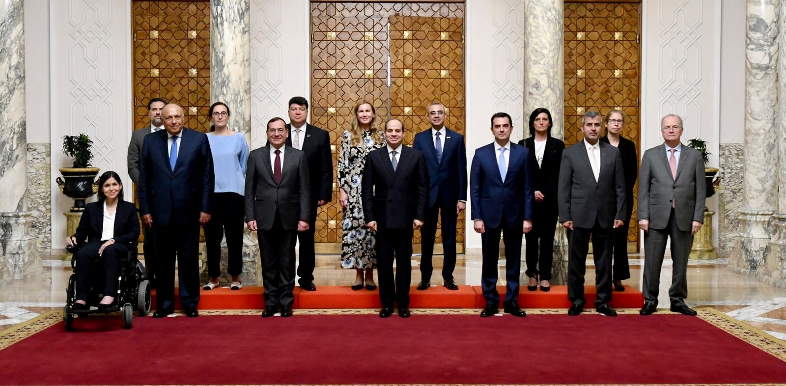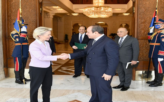 كما استقبل الرئيس عبد الفتاح السيسي اليوم أورسولا فون ديرلاين، رئيسة المفوضية الأوروبية، وذلك بحضور سامح شكري وزير الخارجية، واللواء عباس كامل رئيس المخابرات العامة، والدكتور محمد شاكر وزير الكهرباء والطاقة المتجددة، والمهندس طارق الملا وزير البترول والثروة المعدنية، إلى جانب كادري سيمسون المفوضة الأوروبية للطاقة، والسفير كريستيان برجر سفير الاتحاد الأوروبي بالقاهرة.
