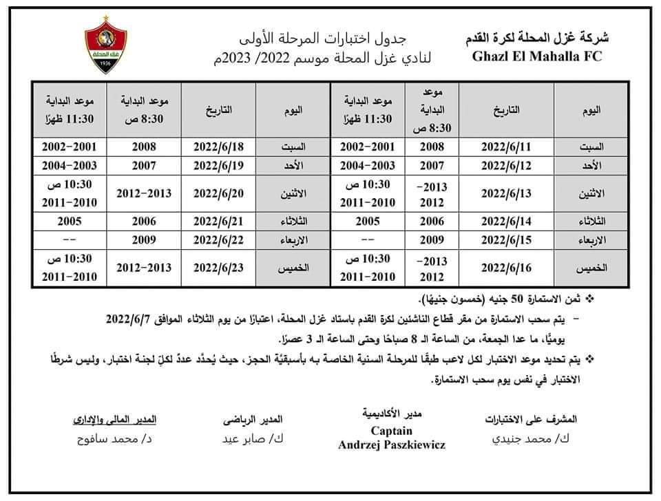 وأعلن نادي غزل المحلة عن بدء اختبارات الناشئين والبراعم في كرة القدم، من مواليد 2001 وحتى 2013 وتبلغ قيمة استمارة اختبارات الناشئين مبلغ 50 جنيهًا، وتُسحَب الاستمارة من مقر قطاع الناشئين لكرة القدم باستاد غزل المحلة.