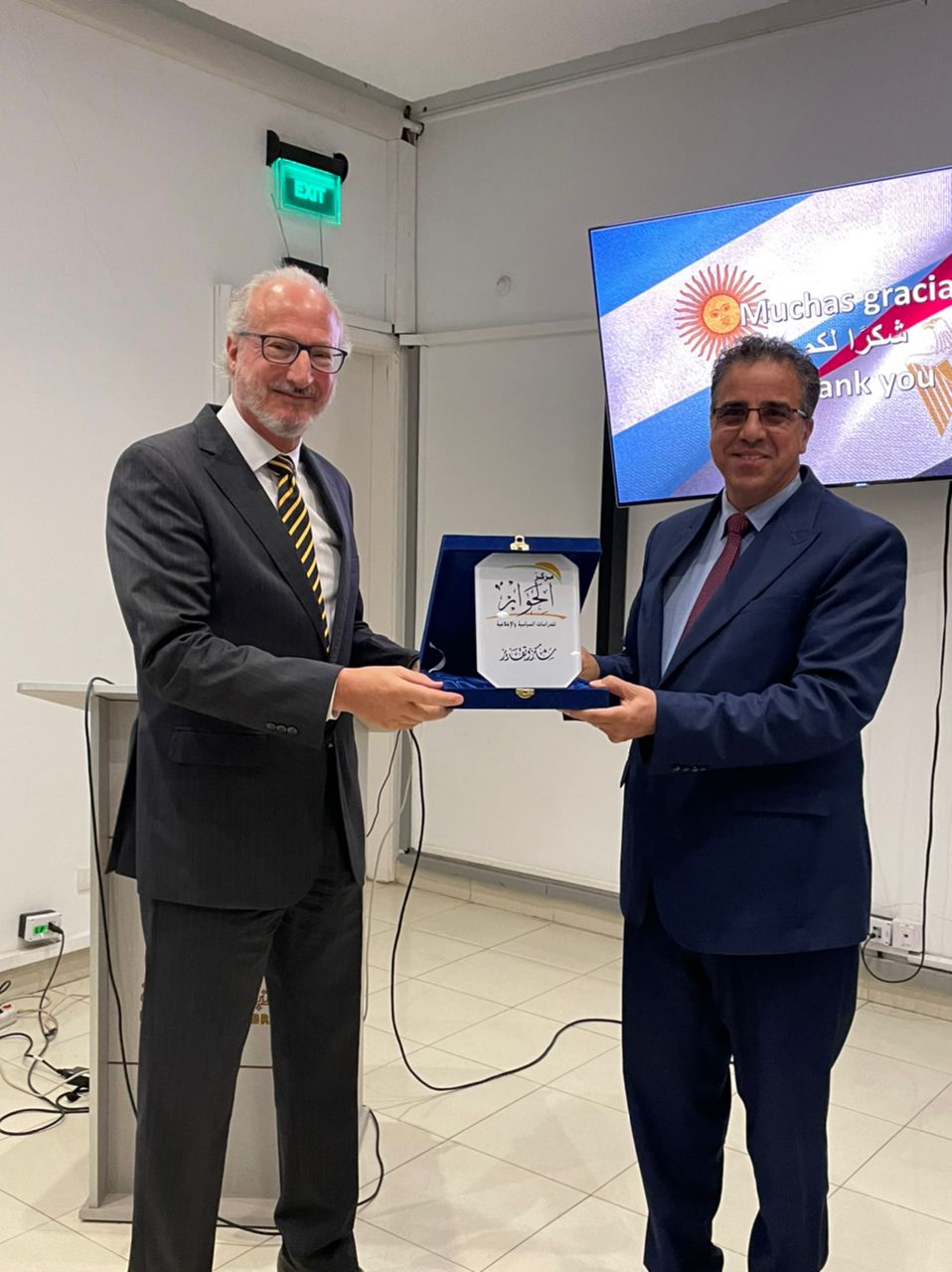 كرم مركز الحوار للدراسات السياسية والإعلامية السفير إدواردو فاريلا سفير الأرجنتين بالقاهرة، وسلم الدكتور هشام مجدي نائب رئيس مجلس أمناء مؤسسة الحوار للبحوث والدراسات الإنسانية درع المركز للسفير الأرجنتيني تقديرًا لجهوده وإسهاماته في تعزيز العلاقات المصرية الأرجنتينية.