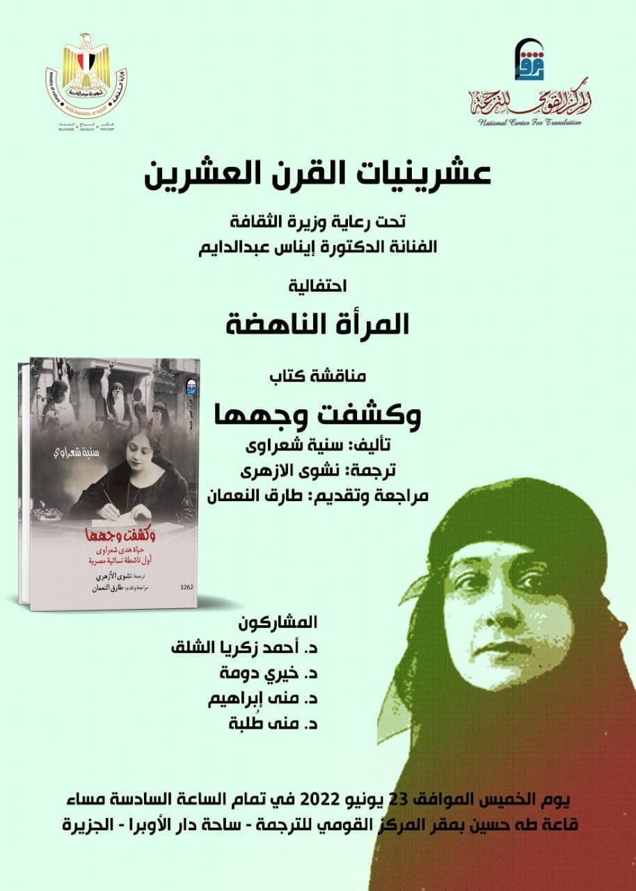 ينظم المركز القومي للترجمة برئاسة الدكتورة كرمة سامي واحتفالية "المرأة الناهضة" حيث يناقش كتاب "وكشفت وجهها: حياة هدى شعراوي أول ناشطة نسائية مصرية " من تأليف سنية شعراوي ومن ترجمة نشوى الأزهري، ومراجعة وتقديم طارق النعمان.