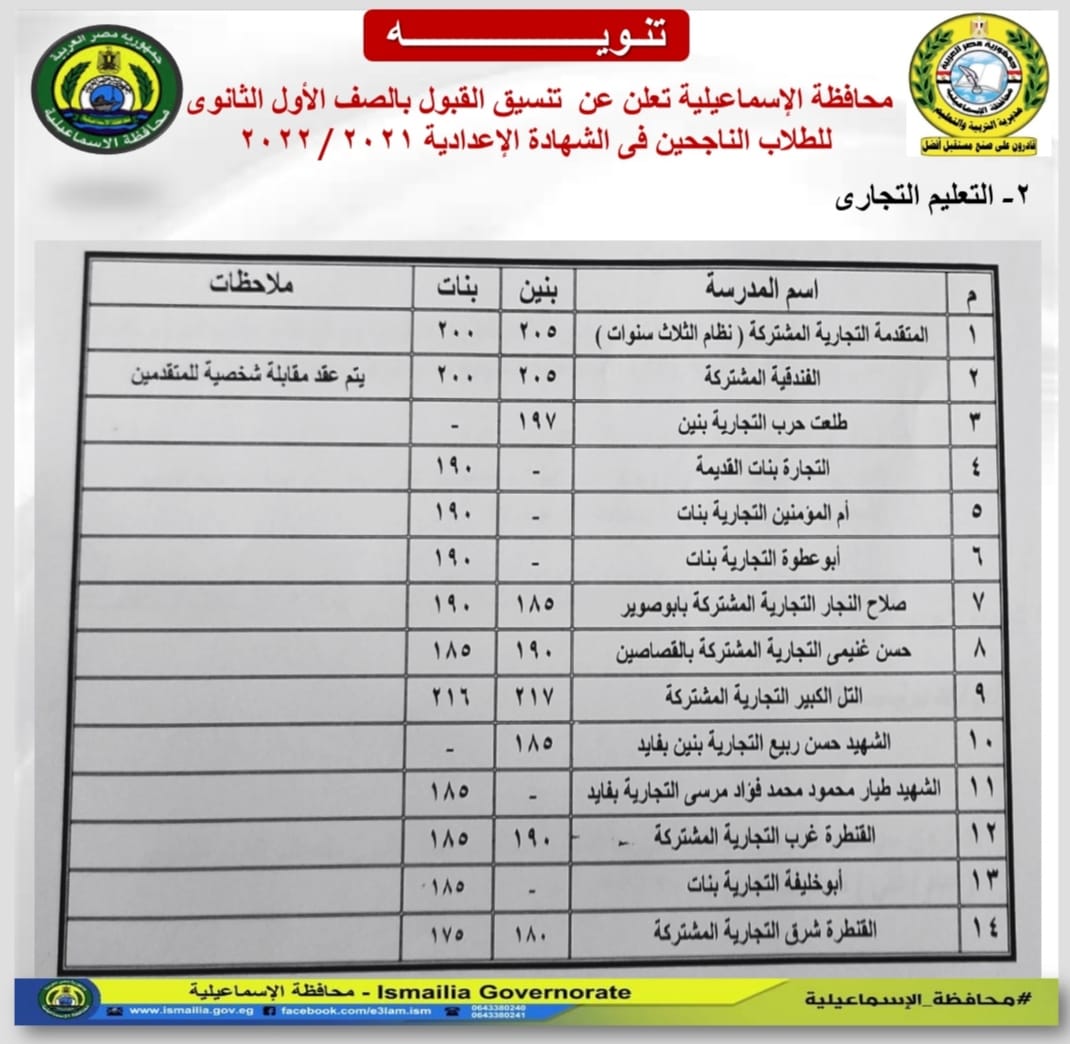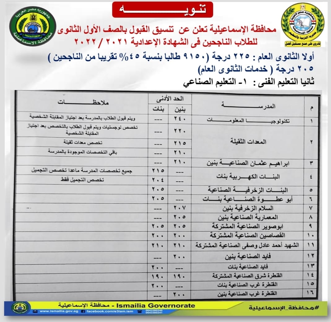 اعتمد اللواء شريف فهمي بشارة محافظ الإسماعيلية، اليوم الخميس، تنسيق القبول بالصف الأول الثانوي للطلاب الناجحين في الشهادة الإعدادية ٢٠٢١/٢٠٢٢ للإلتحاق بصفوف الصف الأول الثانوي العام والفني للعام الدراسي ٢٠٢٣/٢٠٢٢.