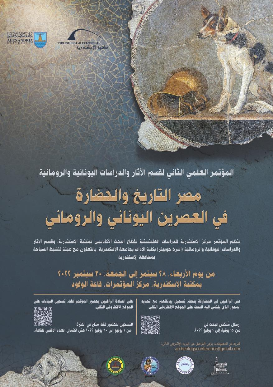 تنظم مكتبة الإسكندرية من خلال مركز الإسكندرية للدراسات الهلينستية بقطاع البحث الأكاديمي بمكتبة الإسكندرية وقسم الآثار والدراسات اليونانية والرومانية (أسرة جوبيتر) بكلية الآداب بجامعة الإسكندرية، بالتعاون مع هيئة تنشيط السياحة بمحافظة الإسكندرية، المؤتمر العلمي الثاني لقسم الآثار والدراسات اليونانية والرومانية بعنوان: مصر التاريخ والحضارة في العصرين اليوناني والروماني ويستمر خلال الفترة من ٢٨ إلى ٣٠ سبتمبر ٢٠٢٢.