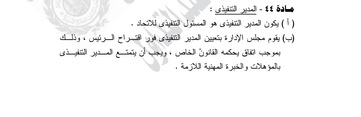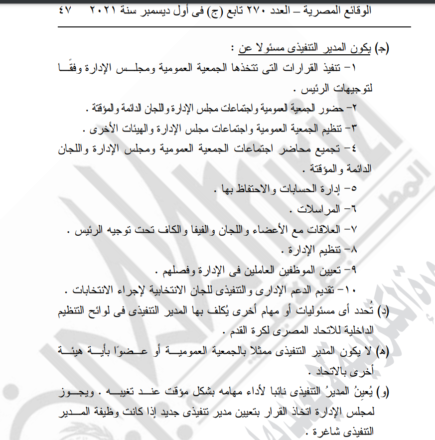 أيضا تنص اللائحة على أن تحدد أي مسئوليات أخرى يكلف بها المدير التنفيذي في لوائح التنظيم الداخلية الخاصة بالاتحاد ولا يكون المدير التنفيذي ممثلا بالجمعية العمومية أو عضوا بأي هيئة أخرى بالاتحاد كما يعين المدير التنفيذي نائبا لأداء مهامه بشكل مؤقت أثناء غيابه ويجوز لمجلس الإدارة اتخاذ قرار بتعيين مدير تنفيذي جديد اذا كانت وظيفة المدير التنفيذي شاغرة.
