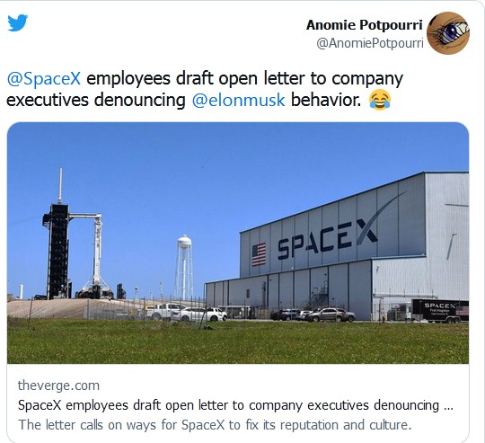 وأشار موظفو الشركة إلى أن ماسك بصفته الرئيس التنفيذي لـ"سبيس إكس"، فإن كل تغريدة منه تعتبر "بيانا عاما للشركة".