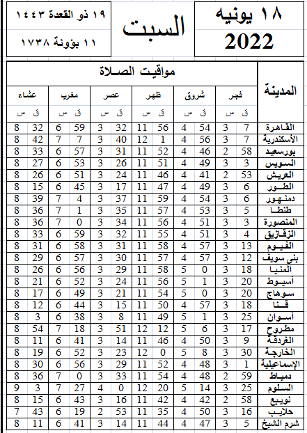 مواقيت الصلاة اليوم وفقًا للتوقيت المحلي لمدينتي القاهرة والإسكندرية وعدد من مدن ومحافظات الجمهورية: