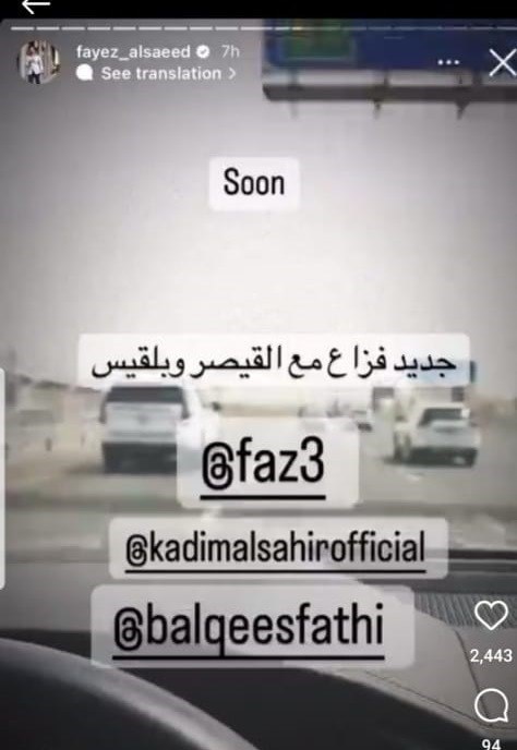 وأعلن السعيد أن "الديو"، الذي من المتوقع أن يحمل اسم "يلي من أسبابك"، أو "أهل العشق"، سيكون متاحًا قريبًا، عبر خاصية "ستوري" في حسابه على "إنستجرام"، موضحًا أن الأغنية الجديدة من ألحانه، ومن كلمات سمو الشيخ حمدان بن محمد بن راشد آل مكتوم (فزاع).