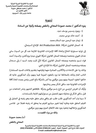 وأكد المحامي أنه تم توليه الدفاع عن السابقين واتخاذ كافة الإجراءات القانونية ضد سامي عدنان أفيوني بشخصه وصفته الممثل القانوني لشركة أفيوني ميديا برودكشن، وأحمد فؤاد نسيم بشخصه وصفته الممثل القانوني لشركة لاكي لايت، وراني مسحال بشخصه وصفته الممثل القانوني لشركة دانا للإنتاج الفني والتوزيع.