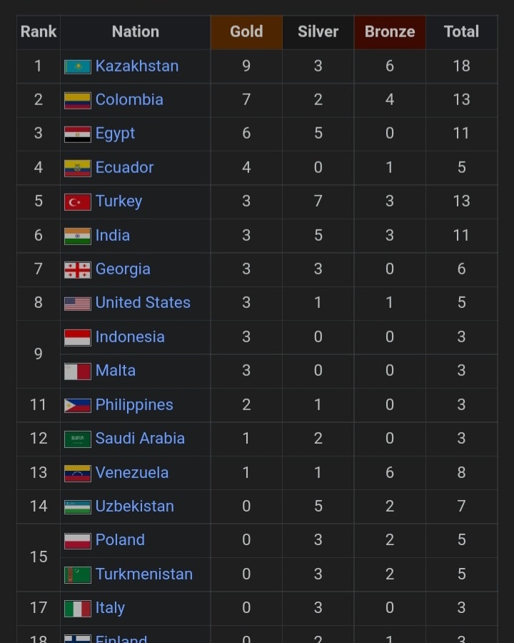 وجاء في المركز الأول منتخب كازاخستان بـ18 ميدالية بواقع 9 ذهبيات و3 فضيات و6 برونزيات.