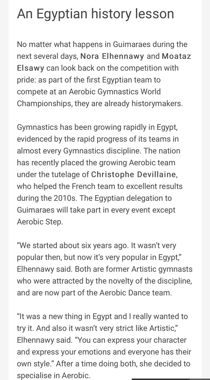 ونشر الموقع الرسمي للاتحاد الدولي للجمباز تقرير عن منتخب مصر وقال: “بغض النظر عما سيحدث في البرتغال التي تستضيف بطولة العالم لجمباز الأيروبيك خلال الأيام الحالية، يمكن لنورا الحناوي ومعتز الصاوي المنافسة بكل فخر، باعتبارهما جزءًا من أول فريق مصري ينافس في بطولة العالم للجمباز الايروبيك، فقد أصبحا بالفعل صانعي التاريخ”.
