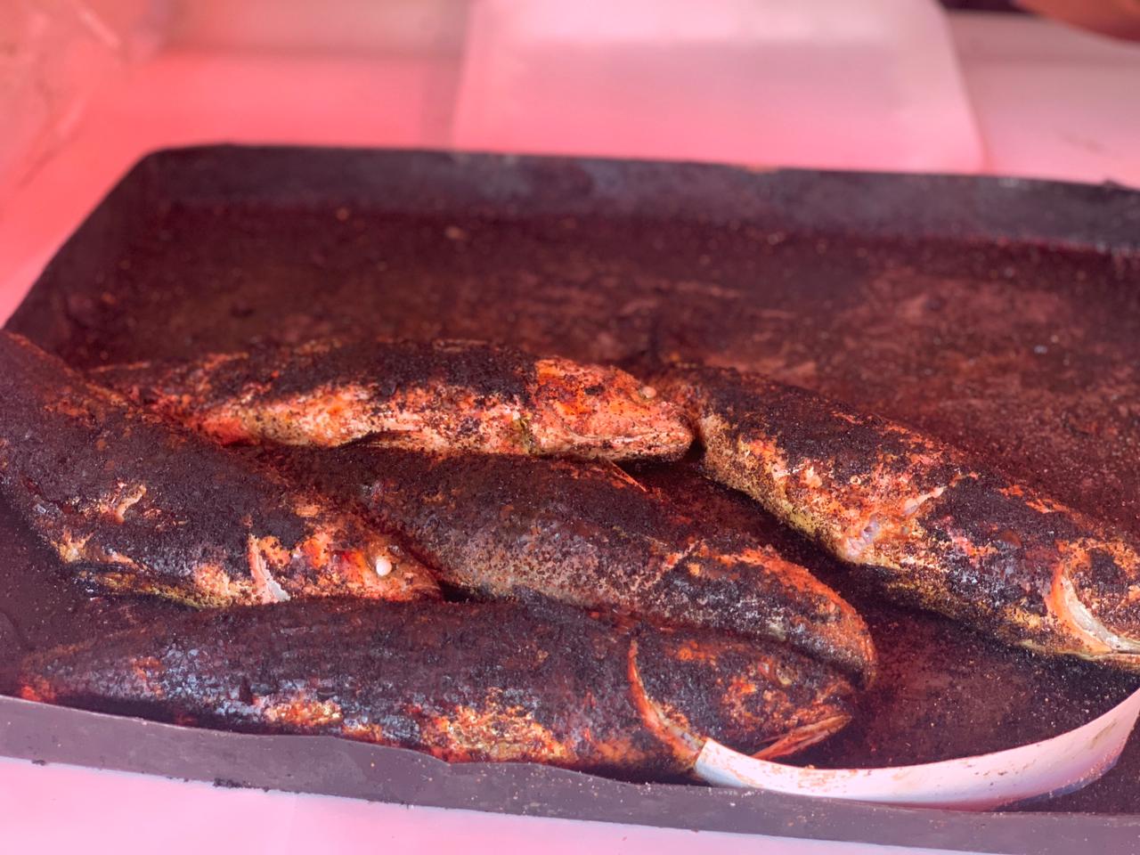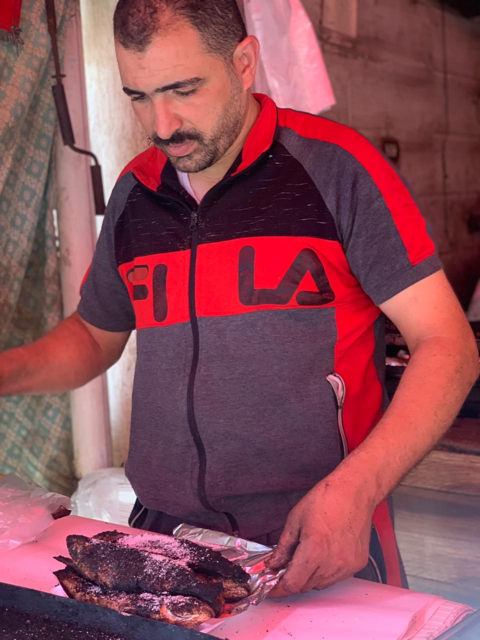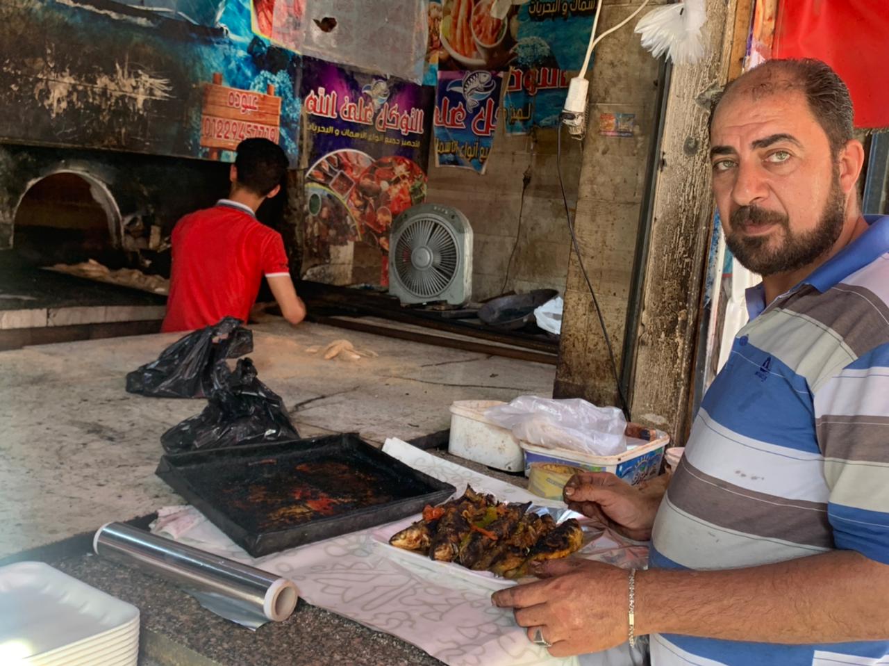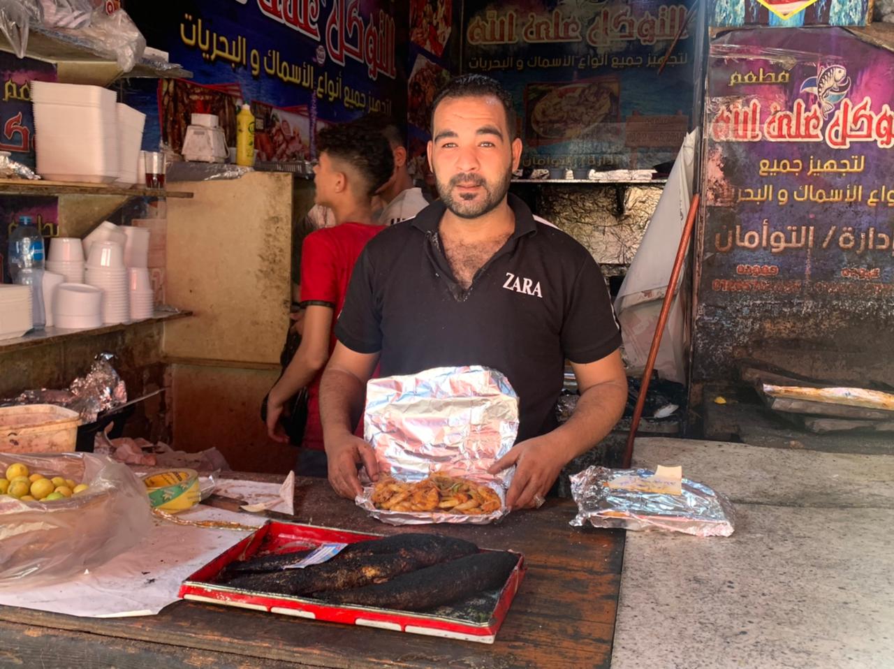 وتابع خلال قيامه بوضع الخلطة على السمك قبل الشوي: أنا أقوم بوضع الردة على السمك قبل الشوي، وبعده يتم وضع الليمون والبهارات الخاصة به"