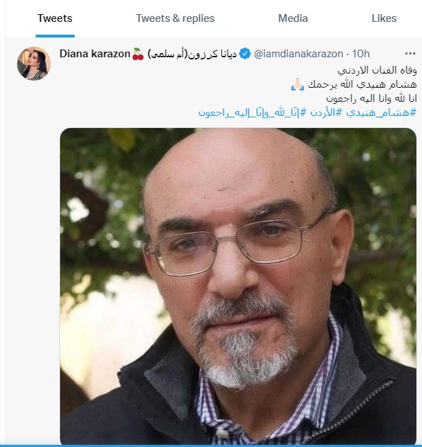 و أكدت النجمة ديانا كرزون خبر وفاة الفنان هشام هنيدي من خلال حسابها الشخصي عبر موقع التدوينات الصغيرة تويتر قائلة " وفاة الفنان الأردني هشام هنيدي الله يرحمك إنا لله وإنا إليه راجعون.