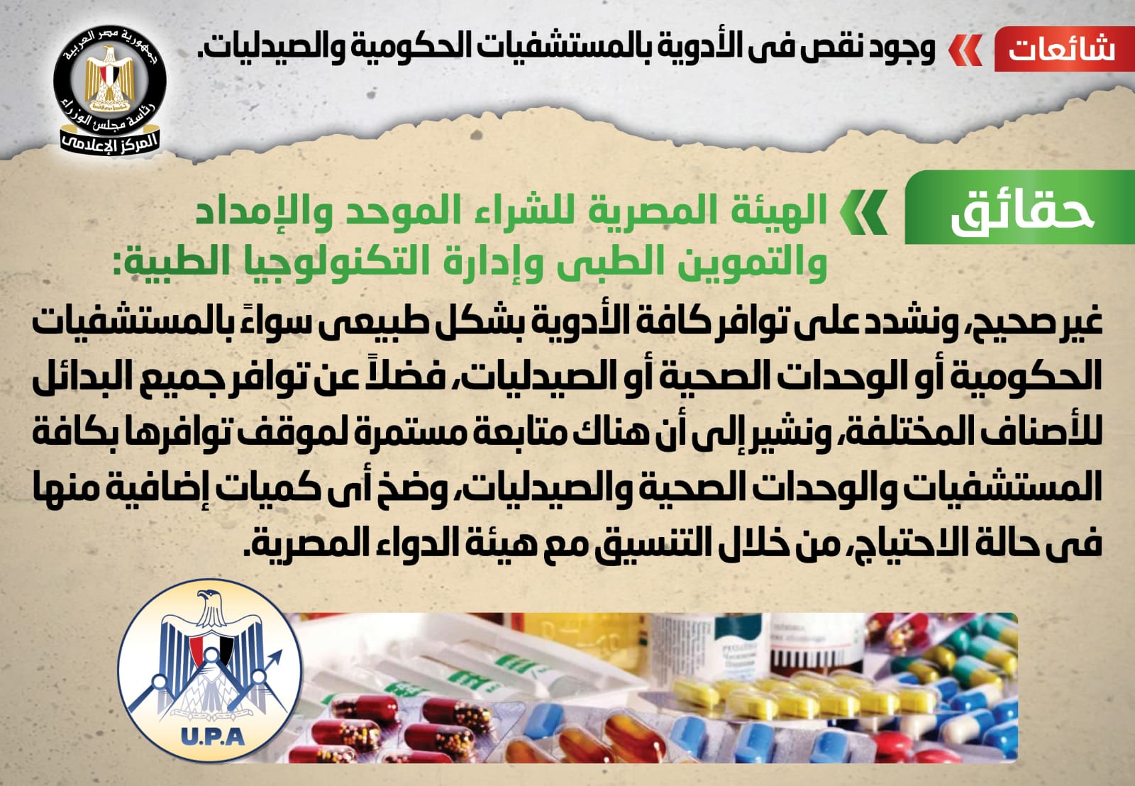 رصد المركز الإعلامي بمجلس الوزراء تداول أنباء بشأن وجود نقص في الأدوية بالمستشفيات الحكومية والصيدليات، وقد قام المركز الإعلامي لمجلس الوزراء بالتواصل مع الهيئة المصرية للشراء الموحد والإمداد والتموين الطبي وإدارة التكنولوجيا الطبية، والتي نفت تلك الأنباء.
