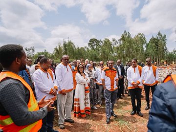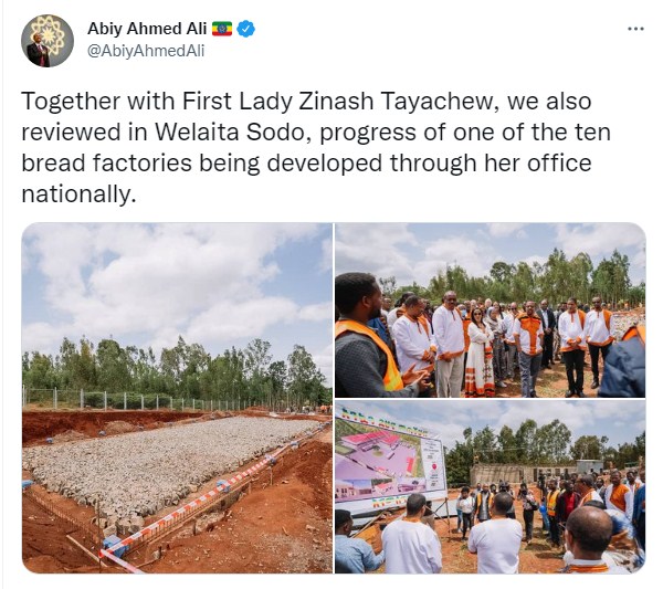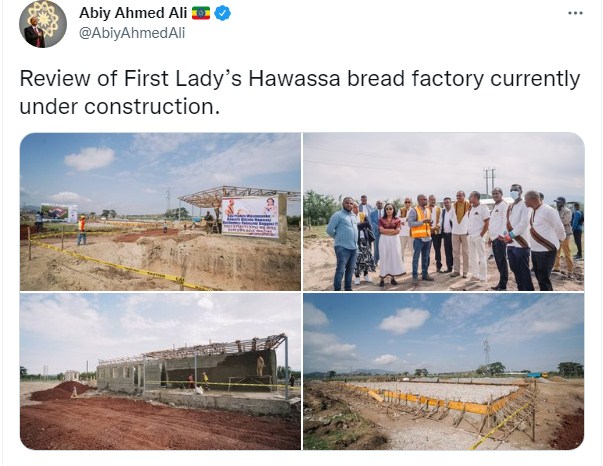 وكتب آبي أحمد تغريدة على تويتر وأرفقها بمجموعة صور له وزوجته في موقع المصنع وقال: "مراجعة لمصنع خبز حواسة للسيدة الأولى قيد الإنشاء حاليًا."