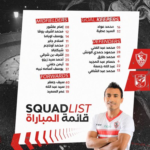 ويغيب عن قائمة الزمالك كل من، محمد أبو جبل وأحمد فتوح وحازم إمام وحمزة المثلوثي وطارق حامد وسيف الدين الجزيري ومحمود علاء.