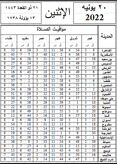 مواقيت الصلاة اليوم وفقًا للتوقيت المحلي لمدينتي القاهرة والإسكندرية وعدد من مدن ومحافظات الجمهورية: