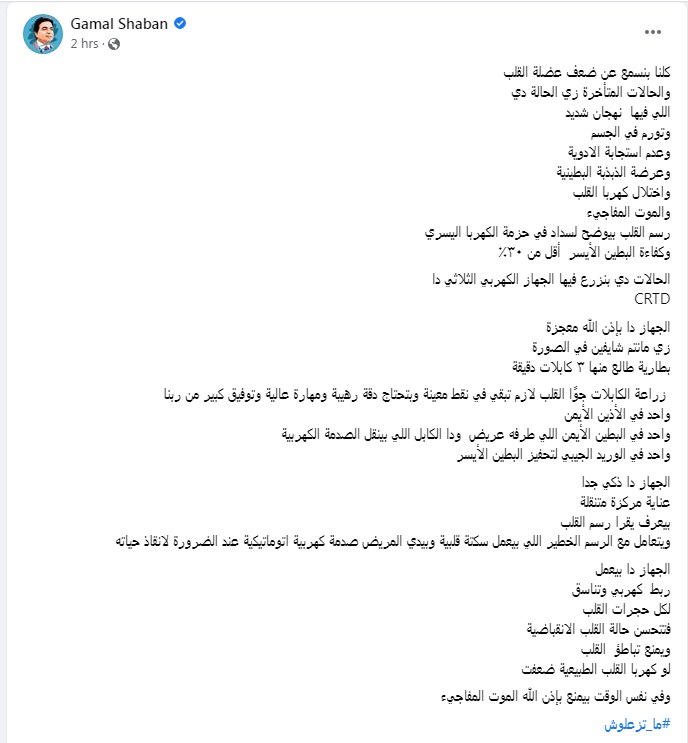 وكتب جمال شعبان تدوينة على الفيس بوك "كلنا بنسمع عن ضعف عضلة القلب والحالات المتأخرة زي الحالة دي اللي فيها نهجان شديد وتورم في الجسم وعدم استجابة الادوية وعرضة الذبذبة البطينية واختلال كهربا القلب والموت المفاجيء"