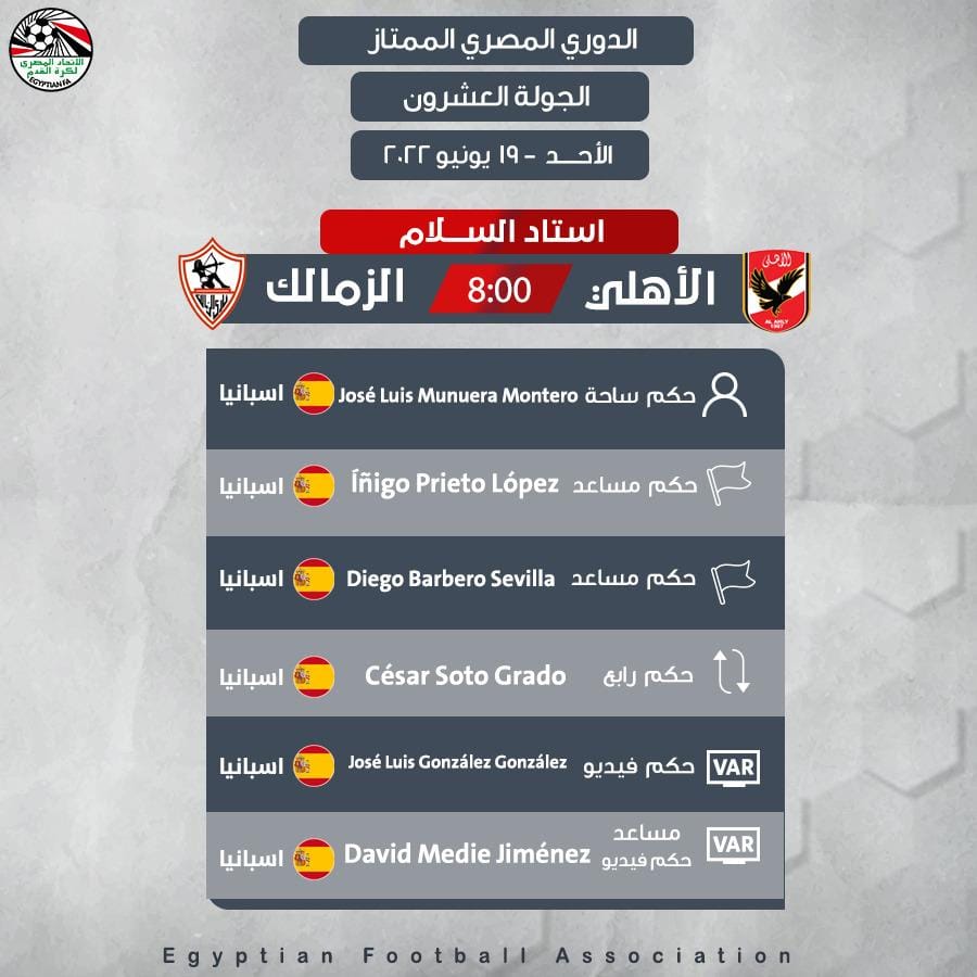 واستقر اتحاد الكرة على إسناد مباراة القمة لطاقم تحكيم إسباني بقيادة خوسيه لويس مونويرا، البالغ من العمر 39 عامًا، وهو حكم دولي من عام 2019.