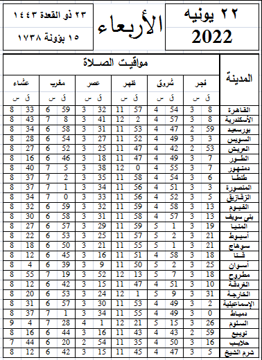 مواقيت الصلاة اليوم وفقًا للتوقيت المحلي لمدينتي القاهرة والإسكندرية وعدد من مدن ومحافظات الجمهورية: