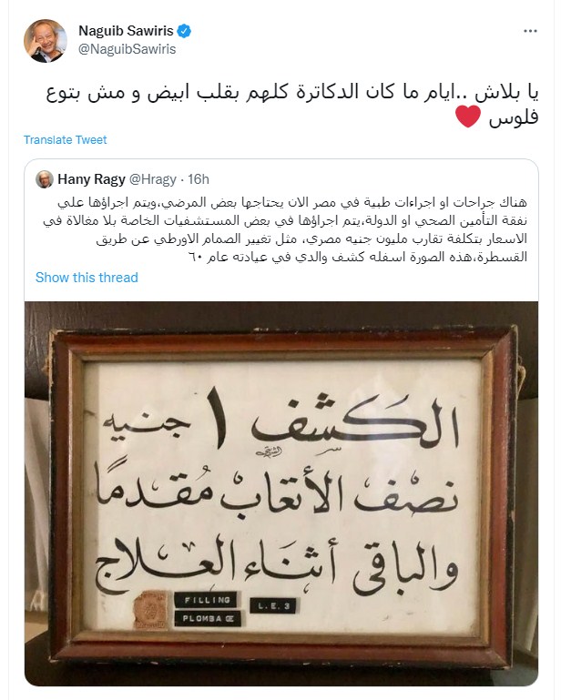 وكتب نجيب ساويرس تعليقًا على الطب أيام زمان فقال: "يا بلاش.. ايام ما كان الدكاترة كلهم بقلب ابيض ومش بتوع فلوس"