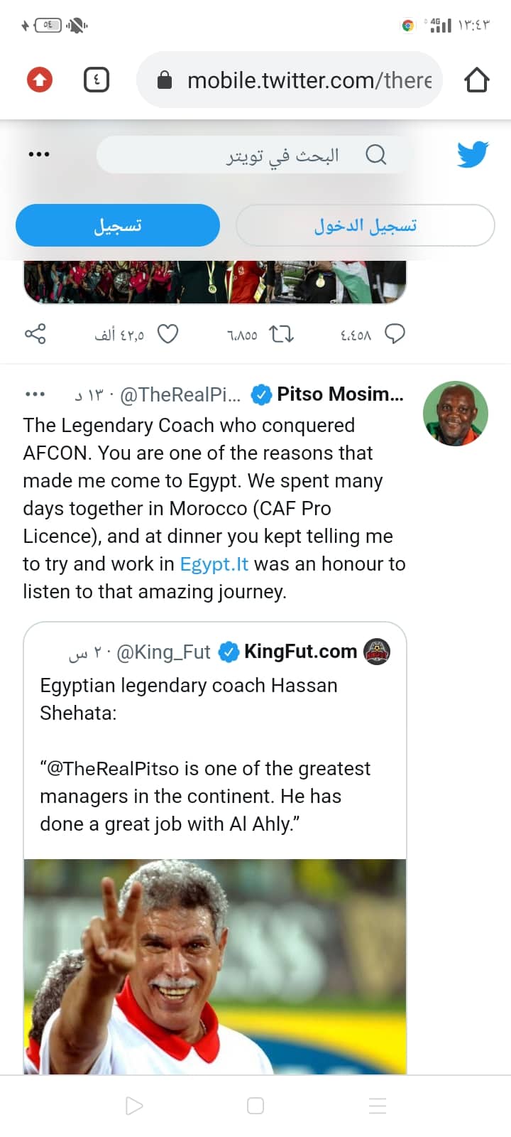 وكتب موسيماني: الأسطورة الذي سيطر على كأس الأمم الأفريقية، لقد أمضينا عدة أيام معًا في المغرب خلال دورة سابقة للمدربين تحت إشراف الكاف، وخلال العشاء أخبرتني بأن أحاول العمل في مصر، وكان شرف لي أن أستمع إلى رحلتك الرائعة.
